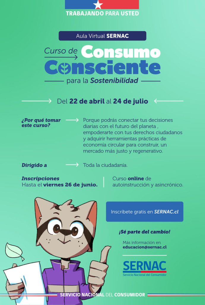 Les compartimos información del Servicio Nacional del Consumidor (SERNAC), que informa el inicio del curso gratuito Consumo Consciente para la Sostenibilidad, cuyo propósito es entregar herramientas y conocimientos para que las personas puedan ejercer su poder de compra de manera consciente, informada y responsable, convirtiéndose en agentes de cambio frente a la crisis climática global.